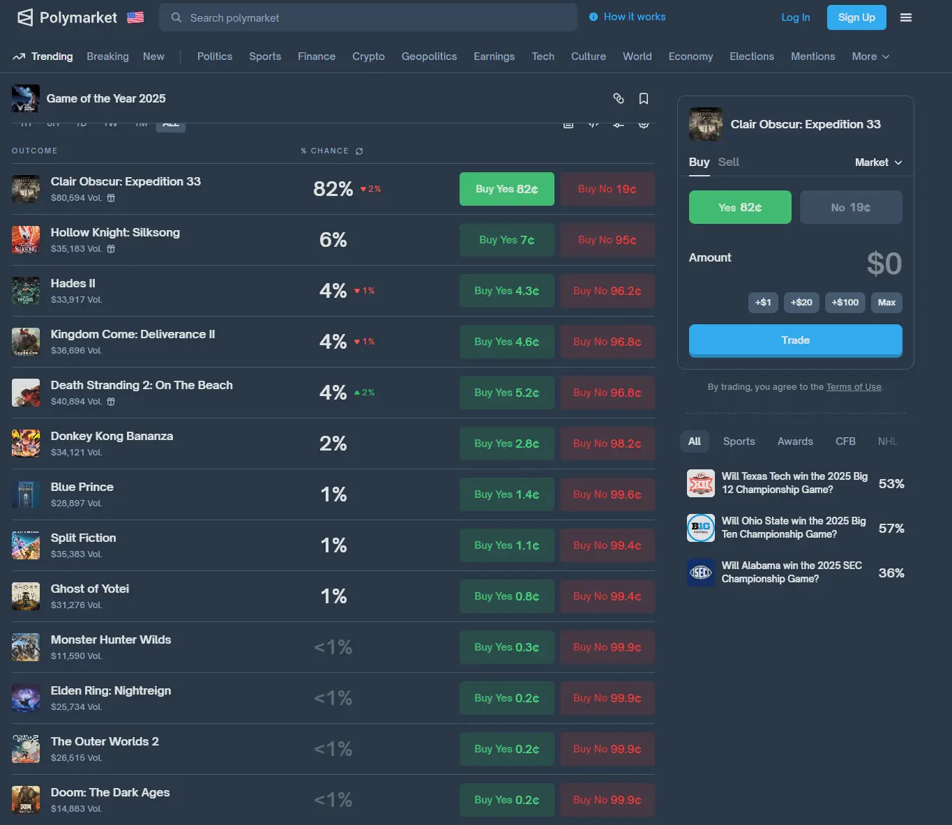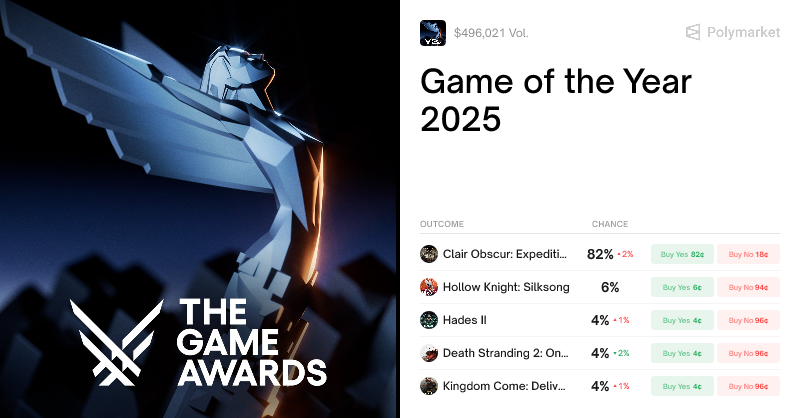 Polymarket | This market will resolve according to the Game that wins Game of the Year at the 2025 Game Awards scheduled for December 11, 2025.